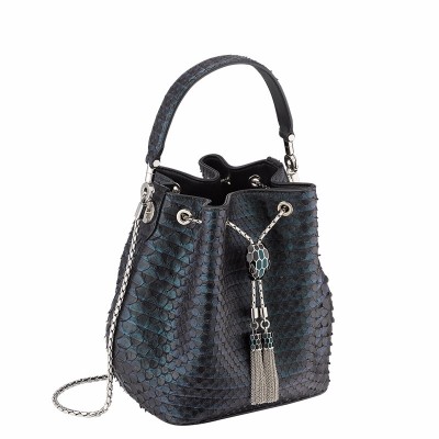 “Serpenti Forever”家族迎来全新杰作:时尚水桶包。这款包采用珍贵的深碧玉色“褶纹”蟒蛇皮材质精制而成,展现BVLGAR I宝格丽以珍贵材料打造经典作品的专业技能。实用的拉绳以BVLGARI宝格丽的方式重新诠释,采用蛇鳞主题链条设计,搭配经典的黑色和深碧玉色珐琅蛇首搭扣和黑色缟玛瑙双眼,尽显魅惑。可拆卸手柄和蛇形链条,以镀钯黄铜制成,令佩戴舒适,多样百搭。小号,单个收纳层,镌刻BVLGAR I宝格丽品牌标识的内侧金属铭牌。