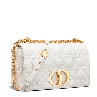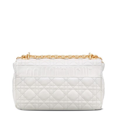 Dior Caro 手袋融合了现代感和永恒的优雅。这款中号款式采用柔软的象牙色小牛皮制成,饰有 Cannage 针脚。这款包的翻盖上点缀着复古金色金属的扭曲 CD 扣环,灵感来自 Christian Dior 香水瓶。带有 CD 标志链节的可拆卸链条肩带可以手提、肩背或斜挎,也可以换成一条来自品牌的宽幅刺绣肩带,白天和晚上都可以佩戴。
